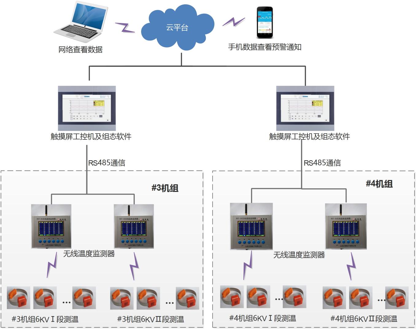 現(xiàn)場需要對二期#3、#4機(jī)組6KV開關(guān)的動觸頭、隔離刀閘、電纜搭接等部位進(jìn)行實(shí)時(shí)溫度監(jiān)測,通過安裝測溫系統(tǒng)來實(shí)時(shí)監(jiān)測設(shè)備的溫升情況,以便檢修人員提前進(jìn)行預(yù)防,以此減少安全隱患。