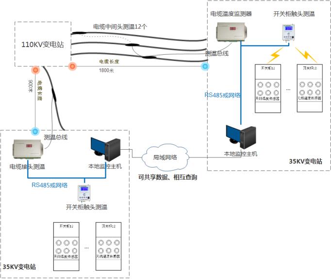 現(xiàn)場(chǎng)有一座110KV變電站,在其下面有兩座35KV變電站,110KV變電站和35KV變電站之間有高壓電纜連接,并有電纜中間接頭需要測(cè)溫,在35KV 配電室需要對(duì)開(kāi)關(guān)柜觸頭進(jìn)行溫度在線(xiàn)監(jiān)測(cè)?,F(xiàn)場(chǎng)需求圖如下: